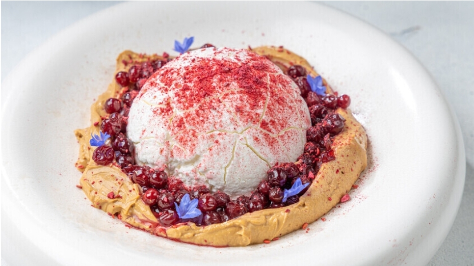 4. Ulupajte slatko vrhnje da se dobije šlag i dodajte pire od jabuka. Za serviranje u restoranu dobivena se masa propušta kroz sifon u tekući dušik kako bi se dobio oblik lopte. Kod kuće šlag možete pažljivo sjediniti s pireom od jabuke kuhačom ili špatulom, a zatim ga staviti u centar posude (2 jušne žlice), okolo poredajte varenjec (2-3 jušne žlice) i pospite brusnicom po ukusu.