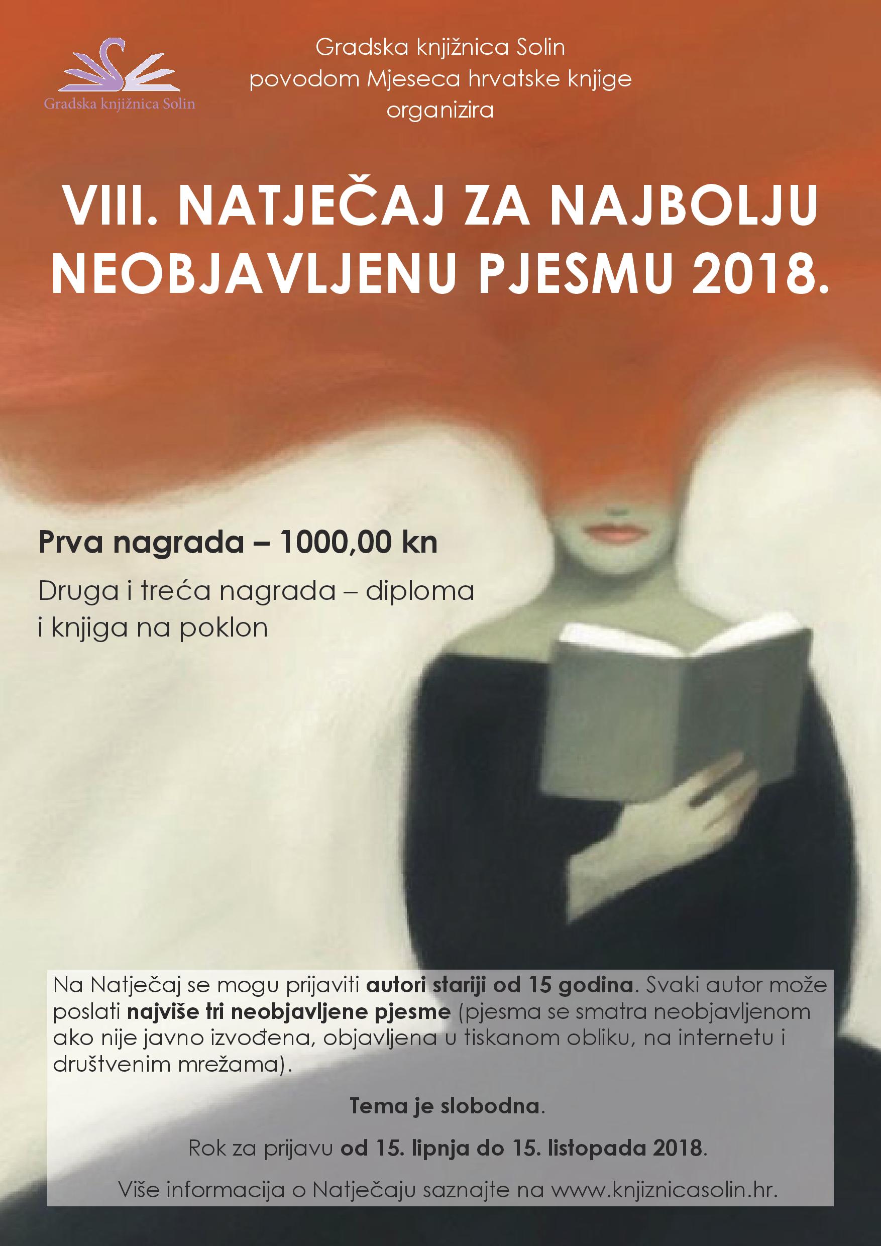 Povodom Mjeseca hrvatske knjige Gradska knjižnica Solin 8. godinu za redom organizira Natječaj za najbolju neobjavljenu pjesmu 2018.g.