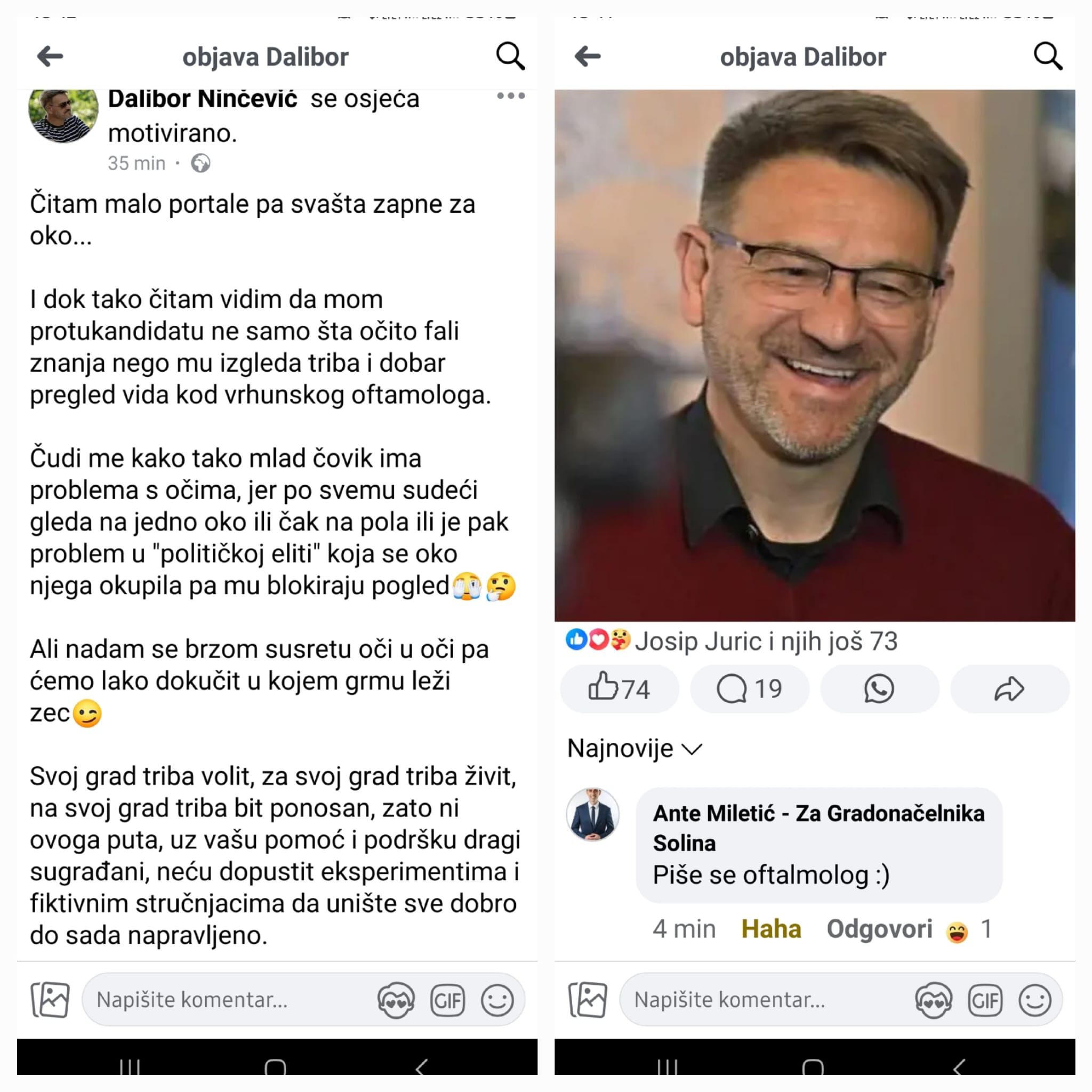Dalibor se u svojoj objavi na facebooku obrušio na protukandidata, spominjući kako mu fali znanja, a možda i dobar pregled kod “oftamologa“. Međutim, scena je dobila obrat kada ga je Ante Miletić, upravo taj protukandidat, elegantno ispravio u komentaru, podsjećajući ga da se pravilno piše “oftalmolog“.