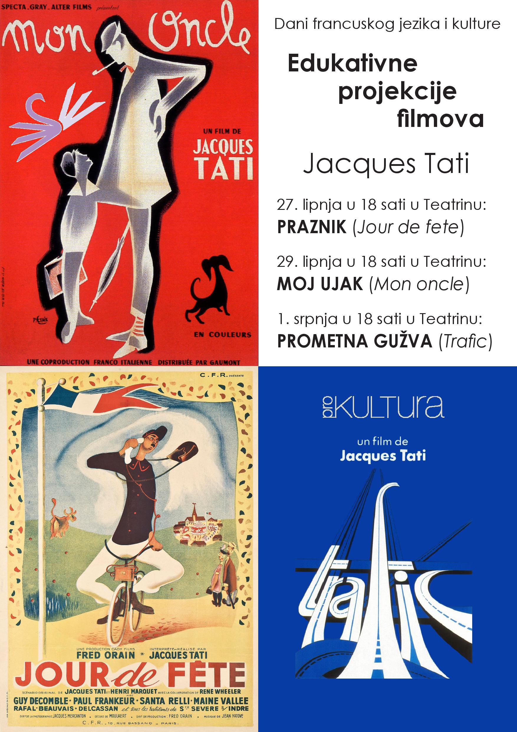 Projekcije će se održavati u Teatrinu Gradske knjižnice Solin u ponedjeljak, 27. lipnja, u srijedu 29. lipnja te u petak, 1. srpnja. Sve projekcije započinju u 18 sati, a prikazivat će se filmovi Jacquesa Tatija, riječ je mahom o komedijama.