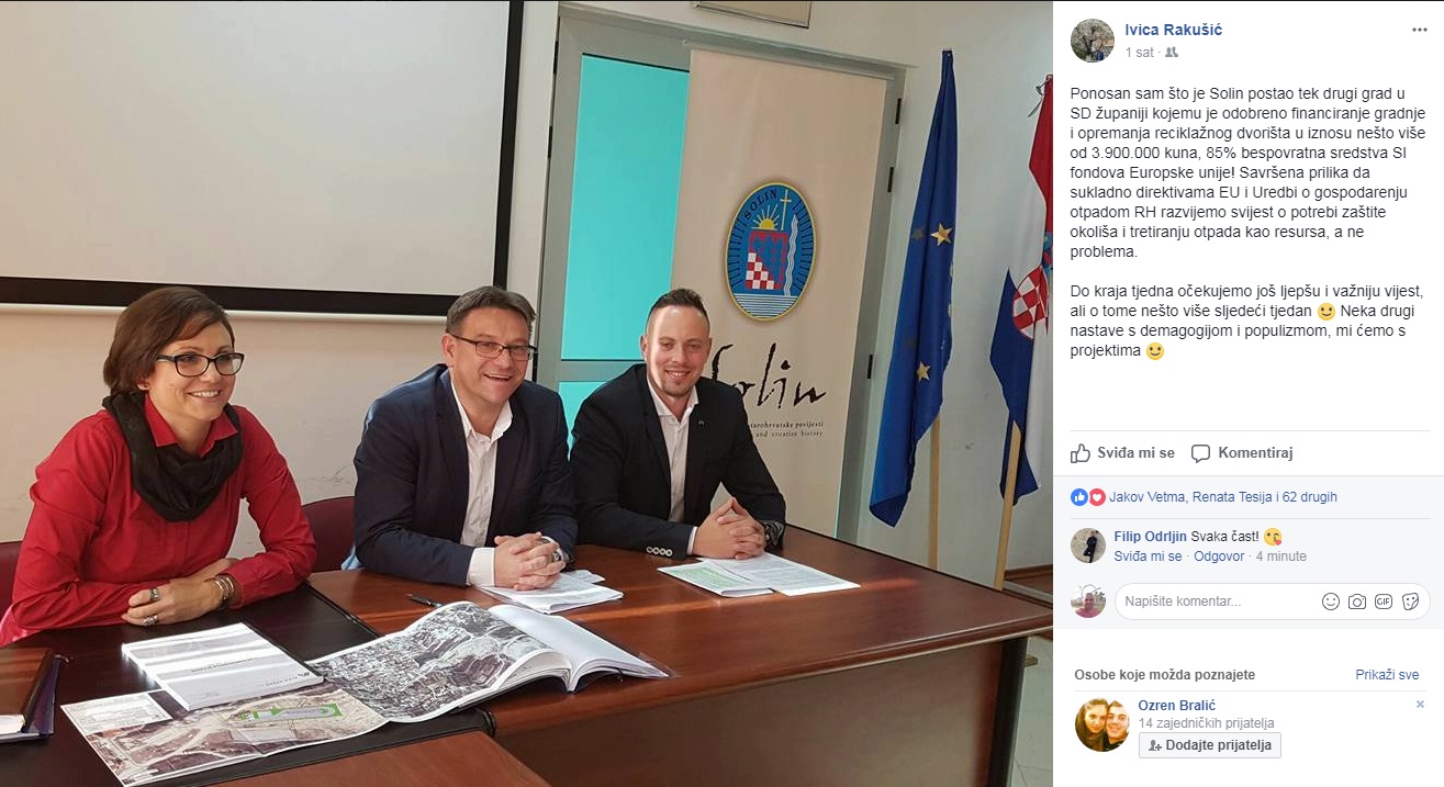 Ivica Rakušić, dogradonačelnik Solina, jučer se na svom facebook profilu pohvalio kako je “ponosan što je Solin postao tek drugi grad u SD županiji kojemu je odobreno financiranje gradnje i opremanja reciklažnog dvorišta u iznosu nešto više od 3.900.000 kuna, 85% bespovratna sredstva SI fondova Europske unije! Savršena prilika da sukladno direktivama EU i Uredbi o gospodarenju otpadom RH razvijemo svijest o potrebi zaštite okoliša i tretiranju otpada kao resursa, a ne problema.”