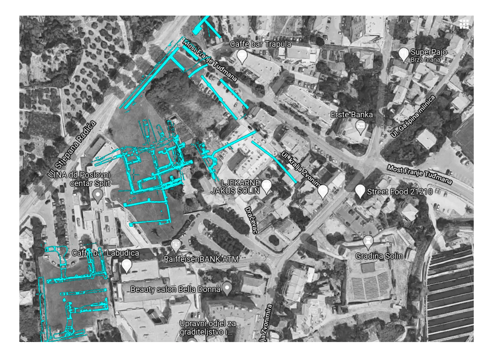 Prostor između ulice Stjepana Radića i ulice Kralja Zvonimira bio je unutar zidina stare Salone i bio je gusto izgrađen. Kao što mi danas širimo grad i izgrađujemo svaku slobodnu parcelu tako su i Rimljani gradili unutar zidina.