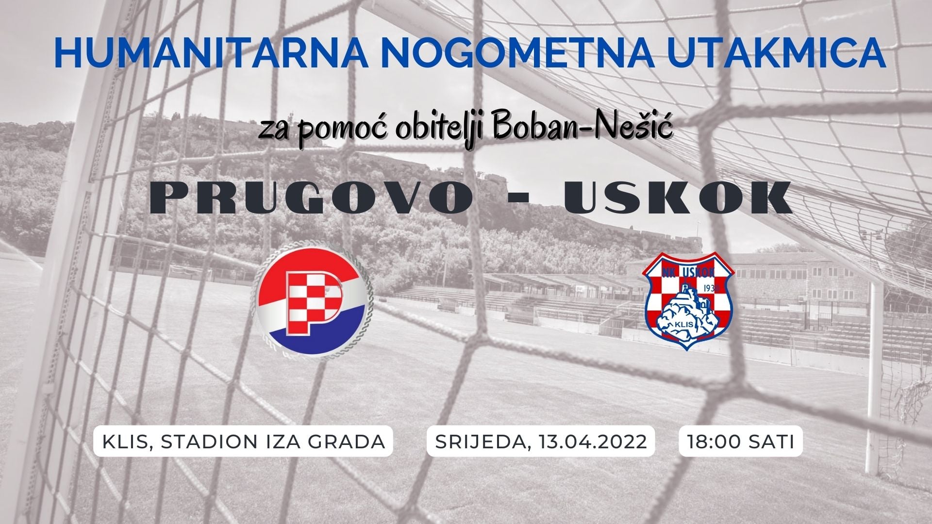 Ove srijede s početkom u 18 sati odigrat će se na stadionu iza Grada humanitarna utakmica Prugova i Uskoka za pomoć obitelji Boban-Nešić, ulaznice po cijeni od 20 kuna možete kupiti u ugostiteljskim objektima s područja općine Klis (Kambia, Belfast, Oprah, Galery, Verona i Big Ben) a sve informacije o pomoći obitelji svi zainteresirani mogu dobiti preko društvenih mreža nogometnih klubova Prugova i Uskoka.