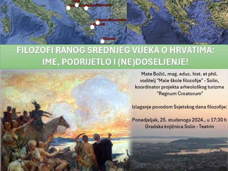 Tematika značenja imena, podrijetla i „dolaska“ Hrvata privlačila je izuzetnu pozornost od samih začetaka suvremene hrvatske historiografije, što je urodilo iznimnim brojem najrazličitijih teorija koje su nastojale razjasniti to pitanje, još od sredine 19. stoljeća pa sve do naših dana. Neke od njih su imale i osobite političke implikacije, a njihovo populariziranje/zabranjivanje je ovisilo i o tada aktualnom društveno-političkom kontekstu. Niti, po hrvatsku povijest burno, 20. stoljeće nije dalo završni odgovor na ovu enigmu. Naprotiv, suvremena važnost očuvanja identiteta u globaliziranom svijetu navedenu problematiku još uvijek čini vrlo aktualnom. Jesu li naposljetku prva desetljeća 21. stoljeća uspjela ponuditi neke nove i prihvatljivije odgovore? O svemu tome publika će imati priliku čuti nešto više u ponedjeljak (25. studenoga) u Gradskoj knjižnici Solin, u okviru izlaganja pod naslovom: „Filozofi ranog srednjeg vijeka o Hrvatima: ime, podrijetlo i (ne)doseljenje!“