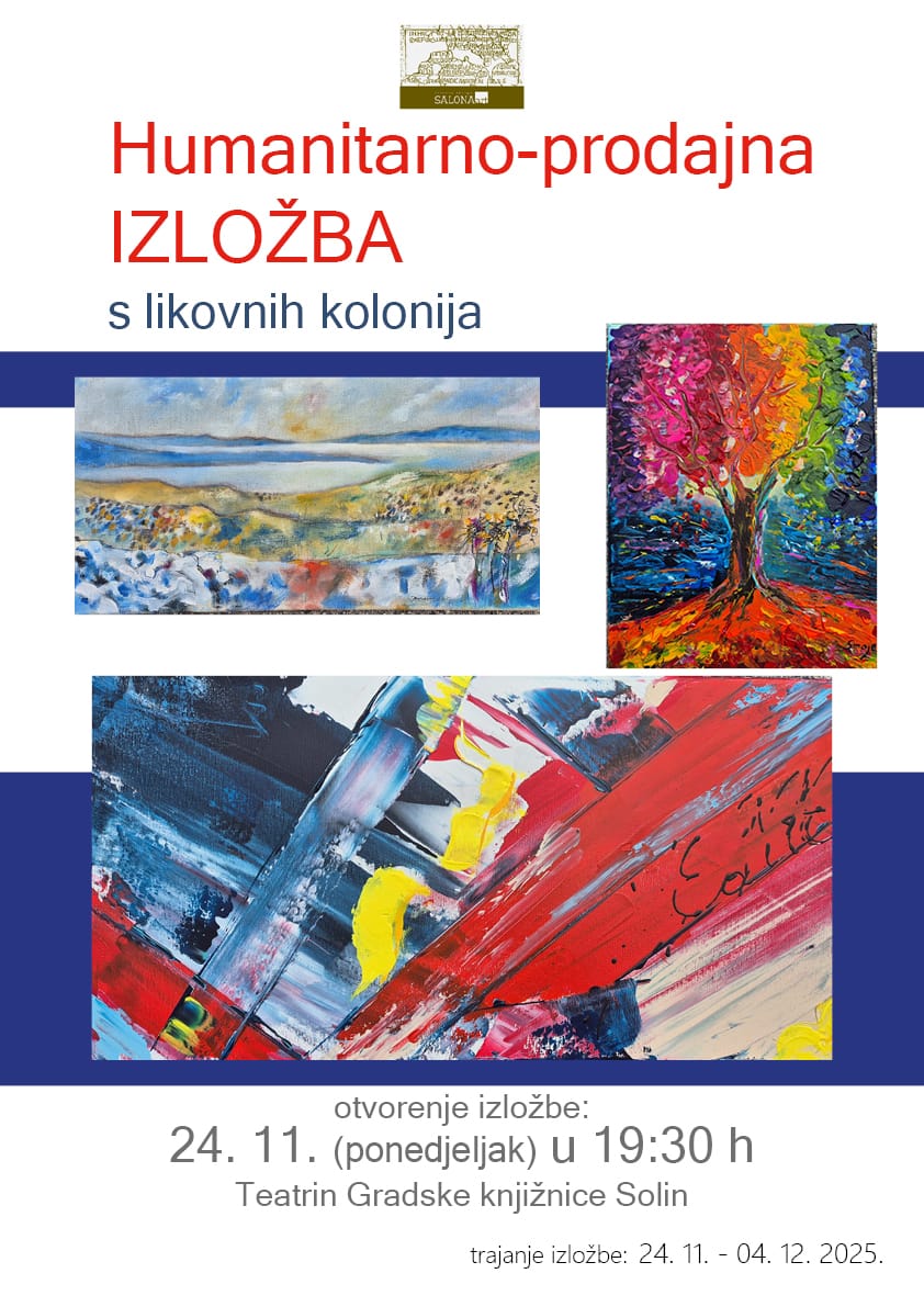 Likovna udruga Salona Art poziva na humanitarno-prodajnu izložbu slika svojih članova i prijatelja, nastalih na likovnim kolonijama u organizaciji Udruge.