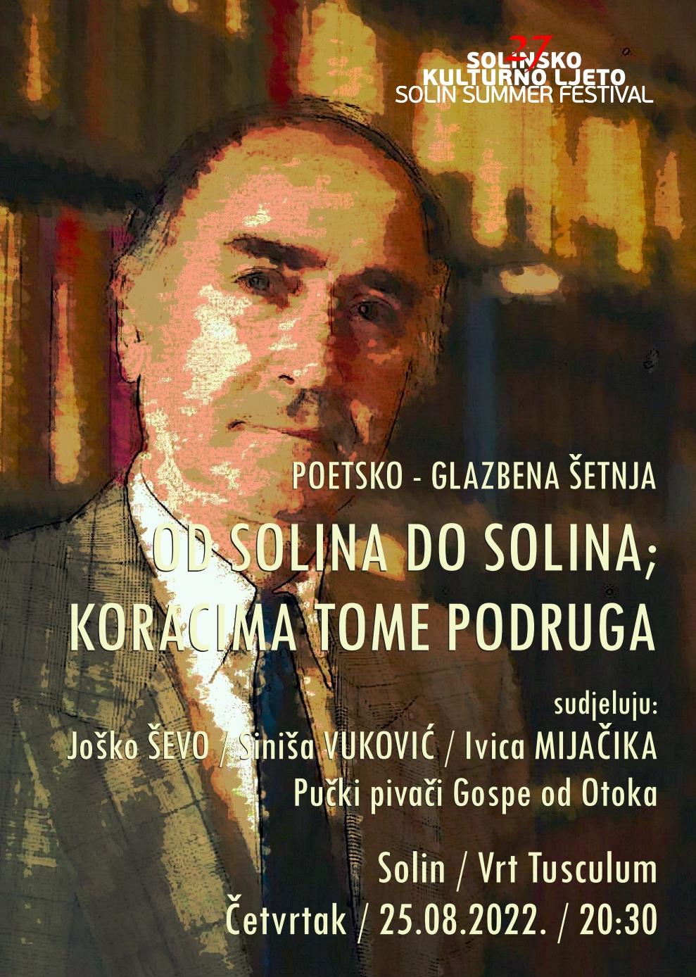 Ovaj poetski recital koji će se održati pod okriljem ovogodišnjeg Solinskog kulturnog ljeta, posvećen ovom istaknutom hrvatskom pjesniku, održat će se upravo na dan njegovog rođenja – 25. kolovoza, u vrtu Tusculum, u tom prekrasnom ambijentu usred antičke Salone.