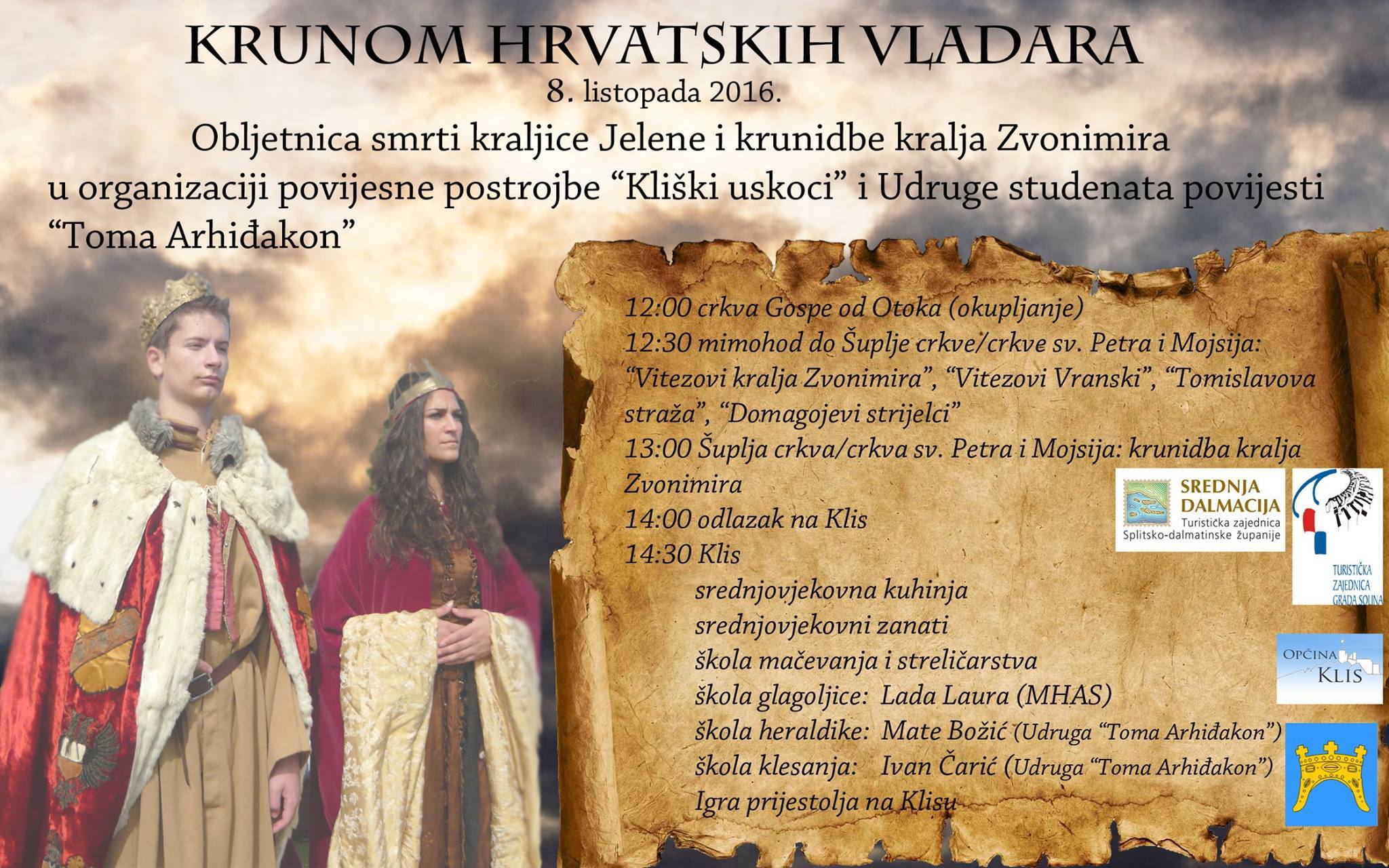 Povijesna postrojba „Kliški uskoci“ i Udruga studenata povijesti „Toma Arhiđakon“ u suradnji s povijesnim postrojbama „Vitezovi kralja Zvonimira“ (Knin), „Vitezovi Vranski“ (Pakoštane), „Domagojevi strijelci“ (Vid) te „Tomislavova straža“ (Split) na Dan neovisnosti Republike Hrvatske, sljedeće subote, 8. listopada 2016. organizira obilježavanje 1040 obljetnice smrti kraljice Jelene (8. listopada 976.) i 940 obljetnice krunidbe kralja Zvonimira (8. listopada 1076.) pod nazivom „Krunom hrvatskih vladara“.