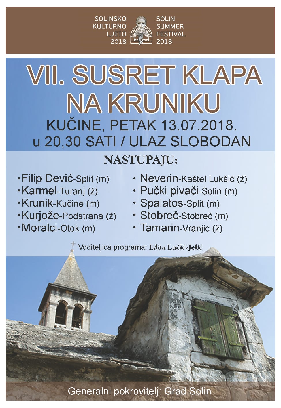 U sklopu Solinskog kulturnog ljeta na pozornici u Kućinama održat će se “VII. Susret klapa na Kruniku“.