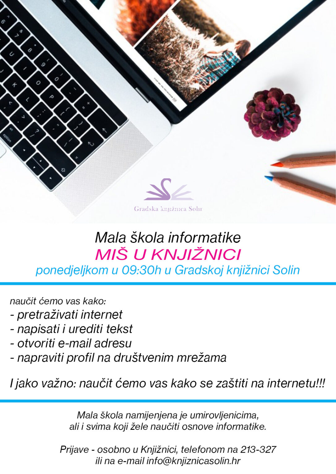 Gradska knjižnica Solin poziva sve zainteresirane na Malu školu informatike “Miš u knjižnici” koja će se od početka svibnja održavati u Knjižnici ponedjeljkom u 09:30 sati. Mala škola namijenjena je umirovljenicima, ali i svima koji žele naučiti osnove informatike. Školu će voditi volonterka, Lucija Mandarić, a sve zainteresirane ona će naučiti kako pretraživati internet, napisati i urediti tekst, otvoriti e-mail adresu, napraviti profil na društvenim mrežama, pokrenuti na svom mobitelu mKnjiznicu (mobilnu aplikaciju Gradske knjižnice Solin) i još nešto jako važno, kako se zaštititi na internetu!