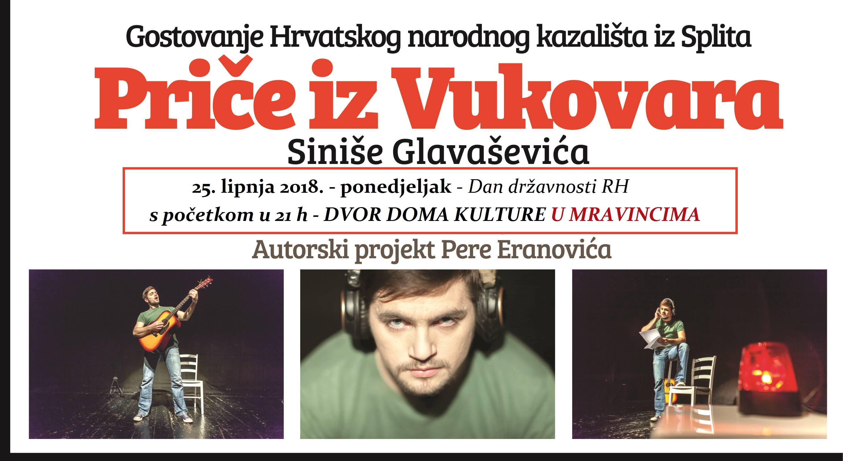 25. lipnja 2018. – ponedjeljak (Dan državnosti RH) – s početkom u 21 sat (DVOR DOMA KULTURE U MRAVINCIMA) monodrama “Priče iz Vukovara”.
