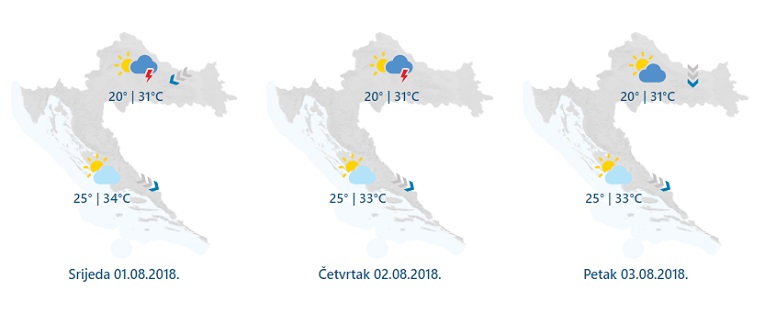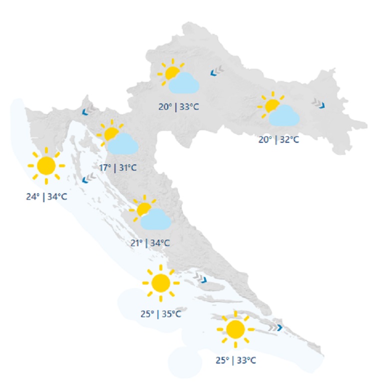 Najniža jutarnja temperatura kretat će se od 17 do 22 °C, na Jadranu od 22 do 25 °C. Najviša dnevna temperatura kretat će se između 31 i 36 °C.