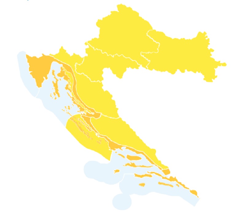 No prema trenutnoj prognozi Meteoalarma, još opasnije vrijeme bit će u riječkoj, splitskoj i dubrovačkoj regiji, za koje je na snazi narančasti meteoalarm zbog maksimalnih temperatura do 33, odnosno 34 °C.