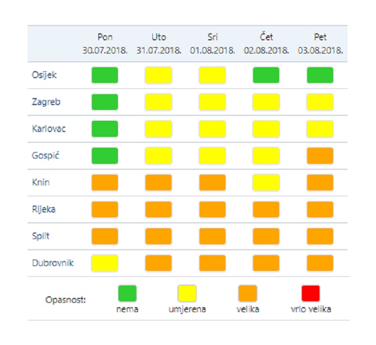 Od srijede, pak, za regiju Osijeka nema opasnosti od toplinskih valova, dok u ostalim regijama ostaju žuta i narančasta upozorenja. I dok će u četvrtak u Kninu opasnost od toplinskog vala pasti na umjerenu razinu, već od petka vratit će se na veliku razinu opasnosti.