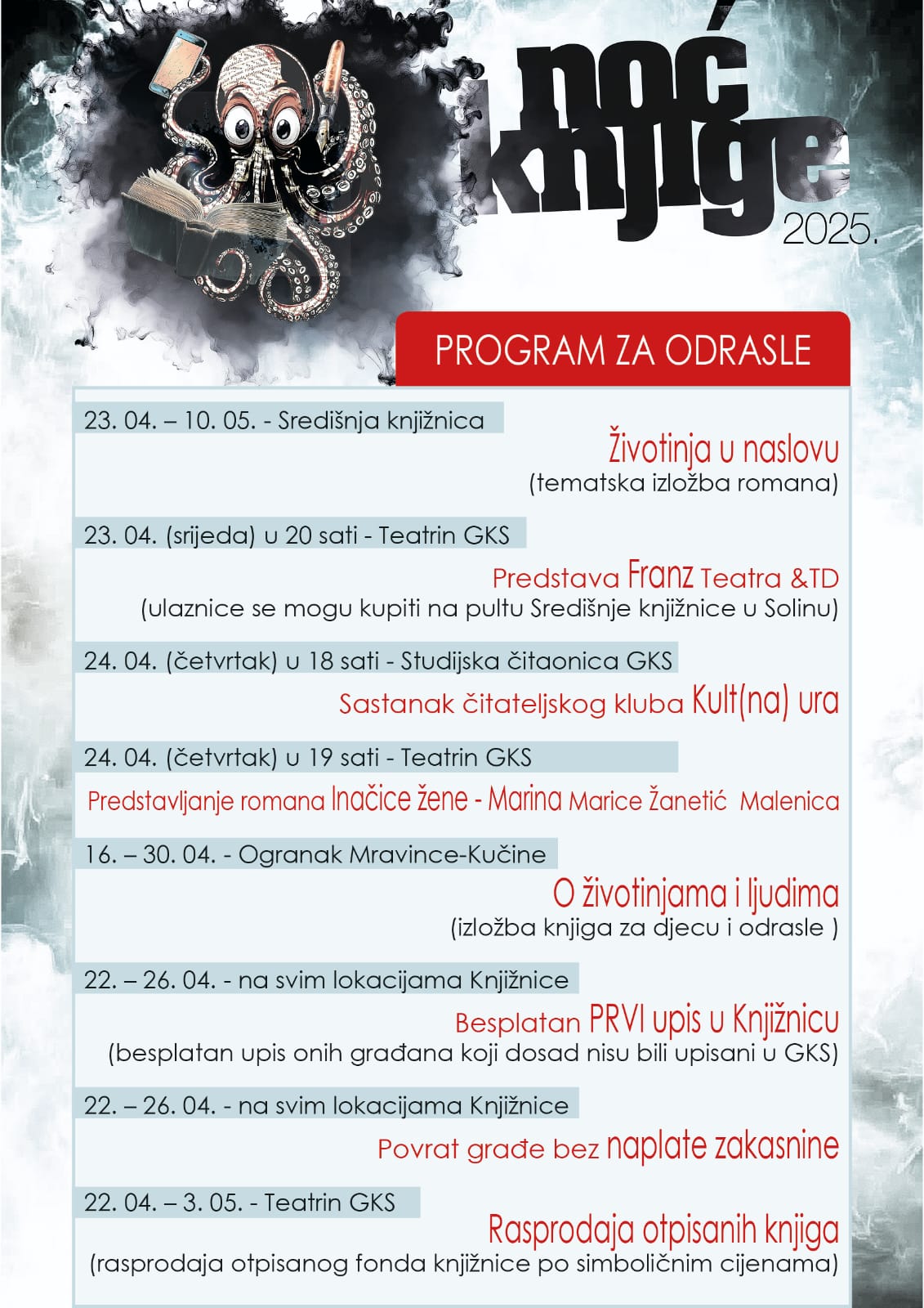 Tu je tjedan vraćanja knjiga bez naplate zakasnine koji započinje u utorak, 22. travnja, potom besplatan prvi upis u knjižnicu, posjetitelji će moći razgledati izložbe knjiga u Središnjoj i Ograncima knjižnice, a za najmlađe će biti organizirane pričaonice i likovne radionice u Ograncima.