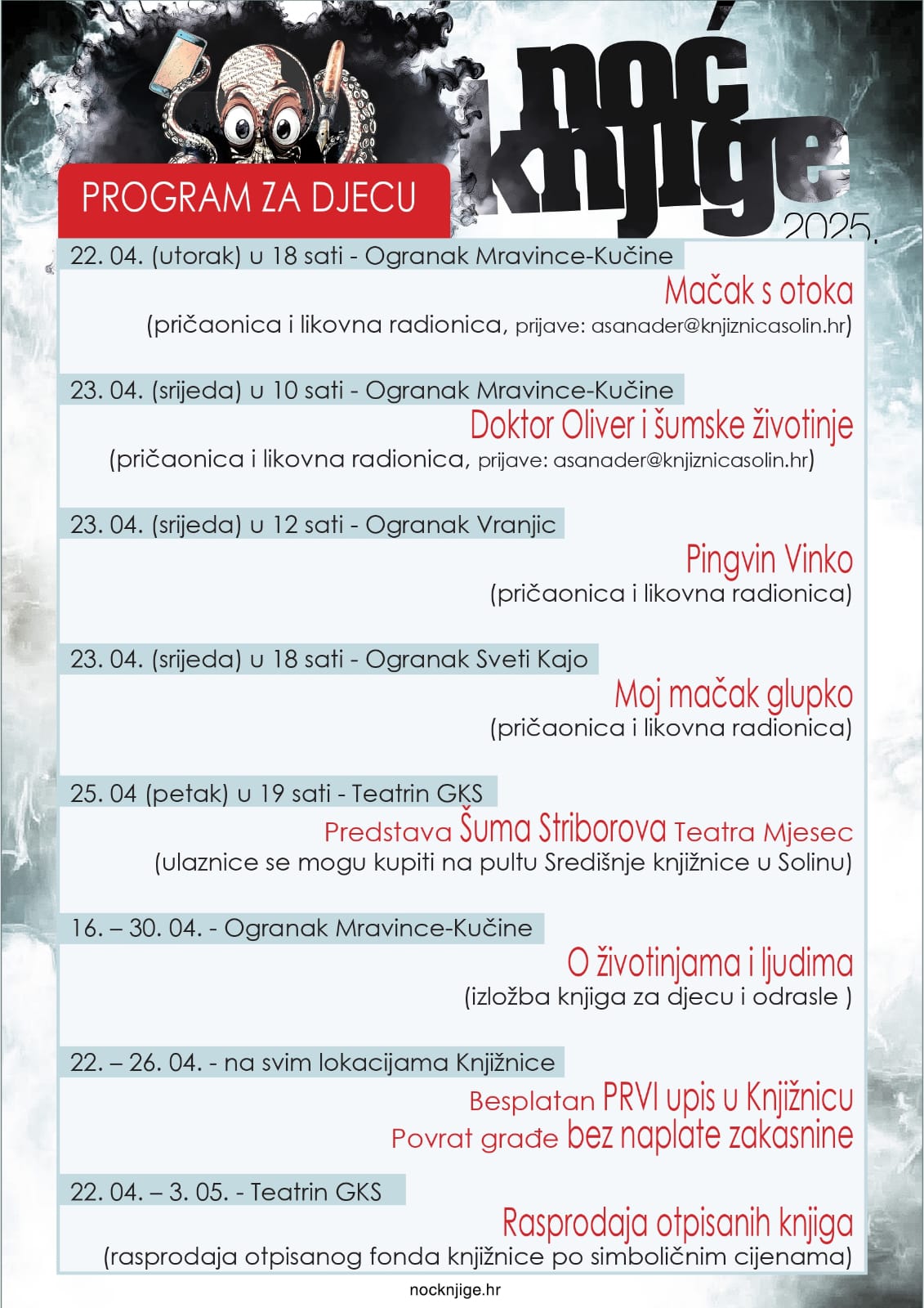 Noć knjige ove se godine organizira pod motom “O životinjama i ljudima”. U Gradskoj knjižnici Solin kao i prethodnih godina pripremili su niz zanimljivih sadržaja i za djecu i za odrasle.