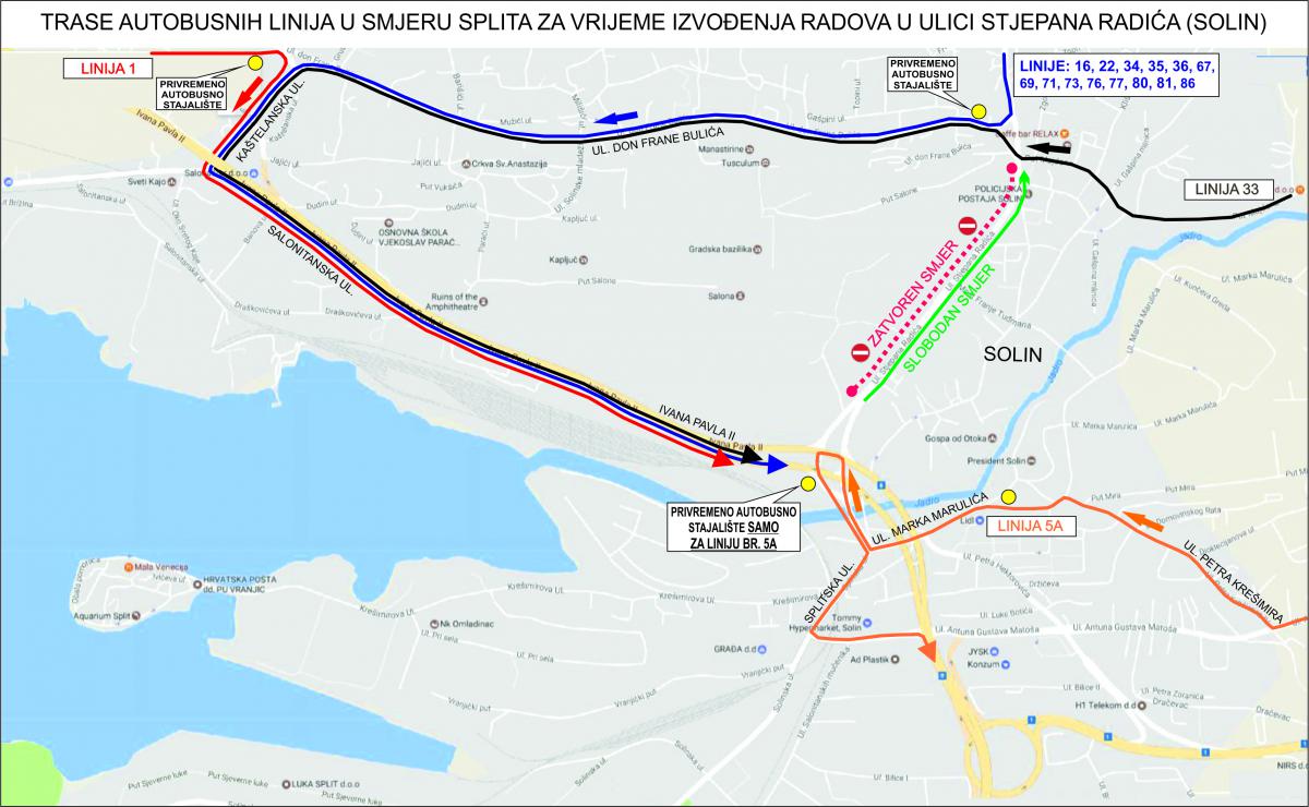Autobusi pod rednim brojevima 16 (Ninčevići-HNK-Ninčevići) i linija 22 (Klis Megdan-G.Rupotina-HNK-Klis Megdan) i sve ostale autobusne linije koje voze iz prigradskih linija, a koje prometuju iz Kisa prema Solinu vozit će od Bilankuše, prema Ulici don Frane Bulića, potom Kaštelanskom ulicom, Salonitanskom prema Širini put Splita.