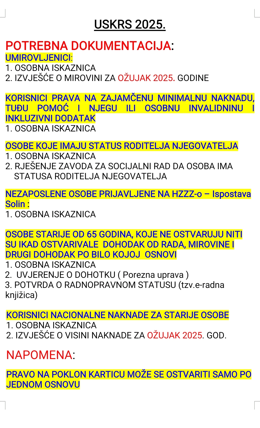 Obavijest o dodjeli uskrsnice umirovljenicima, socijalno ugroženim obiteljima i nezaposlenim osobama s područja grada Solina