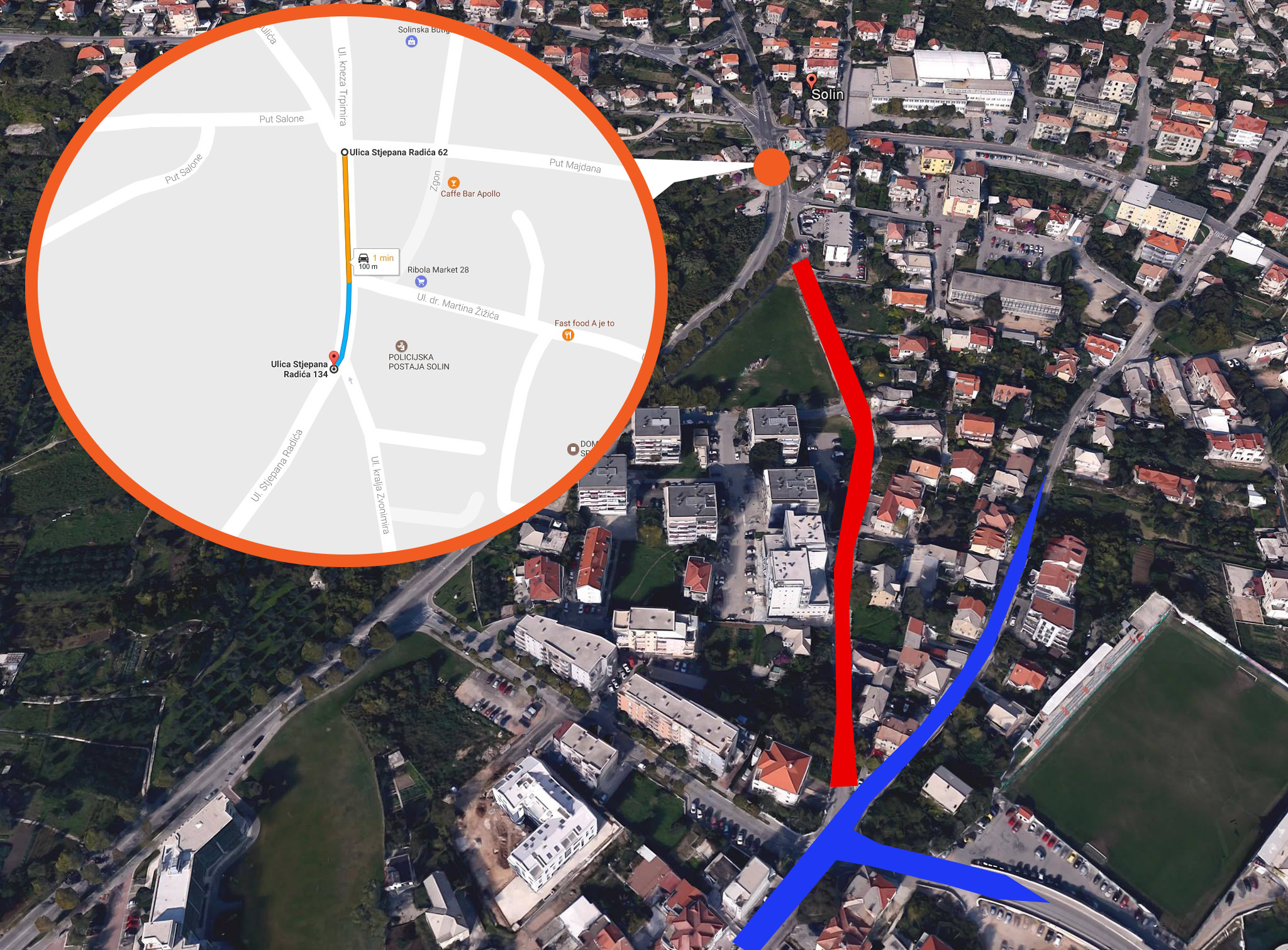 Ulica kralja Zvonimira (crveno) će biti dvosmjerna i to samo za stanare tog dijela Solina. Ostali promet iz pravca Zvonimirove će biti preusmjeren kroz Ulicu Gašpina mlinica ili preko Tuđmanovog mosta (plavo).