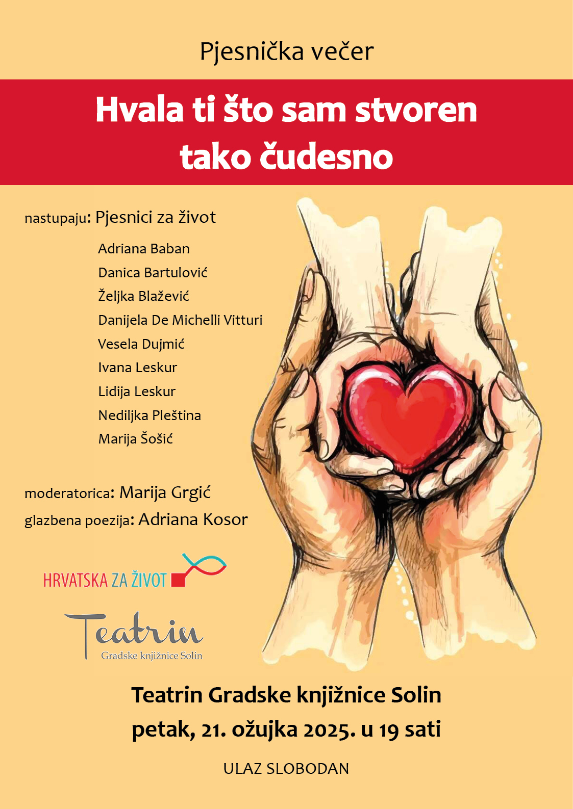 U Teatrinu Gradske knjižnice Solin u petak 21. ožujka u 19h Pjesnici za život organiziraju poetsku večer pod imenom ”Hvala ti što sam stvoren tako čudesno”.