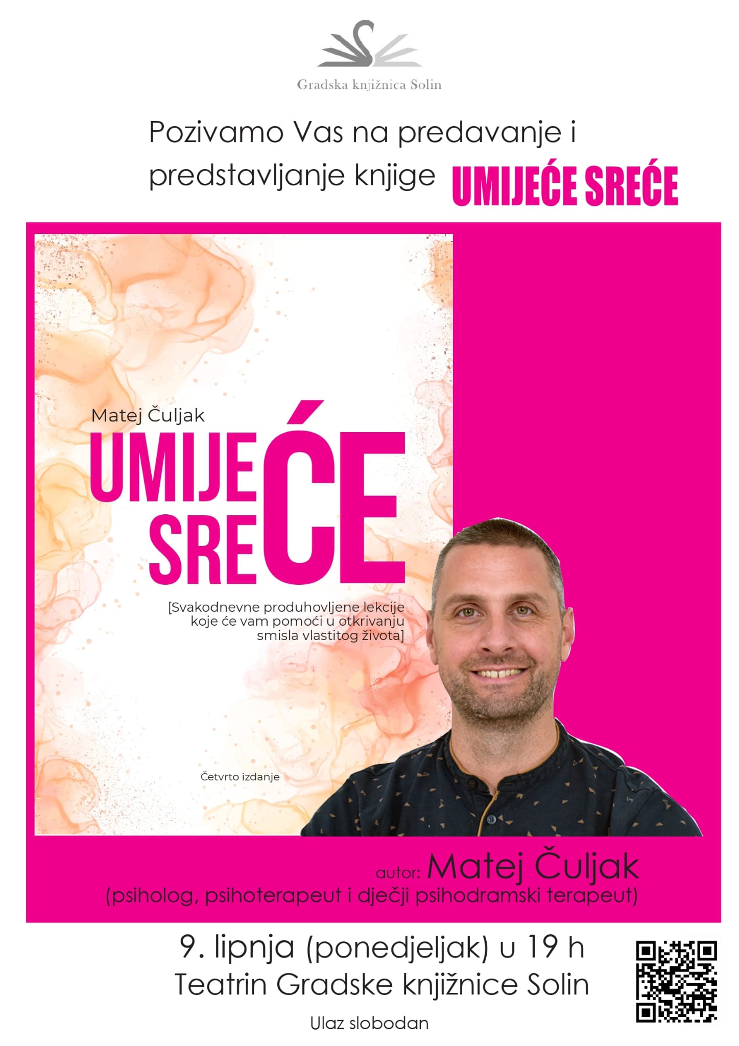 U ponedjeljak, 9. lipnja 2025. u Teatrinu Gradske knjižnice Solin s početkom u 19 sati bit će predstavljena knjiga ”Umijeće sreće” autora Mateja Čuljka, psihologa, psihoterapeuta i dječjeg psihodramskog terapeuta.