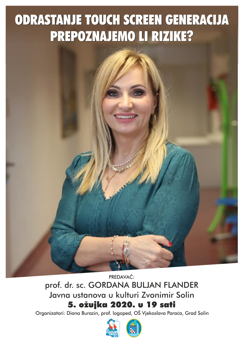 Prof. dr. sc. Gordana Buljan Flander 5. ožujka (četvrtak) s početkom u 19 h održat će predavanje pod naslovom “Odrastanje touch screen generacija – prepoznajemo li rizike?” u Javnoj ustanovi u kulturi Zvonimir Solin. Predavanje je namijenjeno učiteljima, stručnim suradnicima, roditeljima i svima onima koji se bave djecom i mladima.