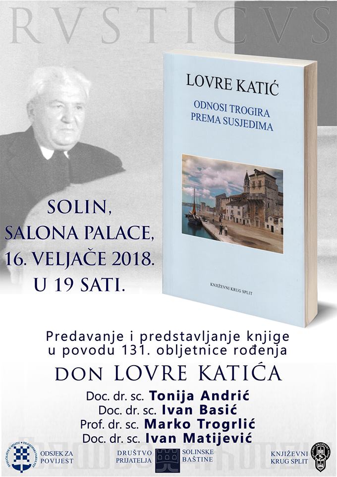 U suradnji s Odsjekom za povijest Filozofskoga fakulteta u Splitu i Književnim krugom Split, Društvo prijatelja solinske baštine organizira predavanje i predstavljanje knjige u povodu 131. obljetnice rođenja hrvatskog povjesničara i solinskoga velikana don Lovre Katića.