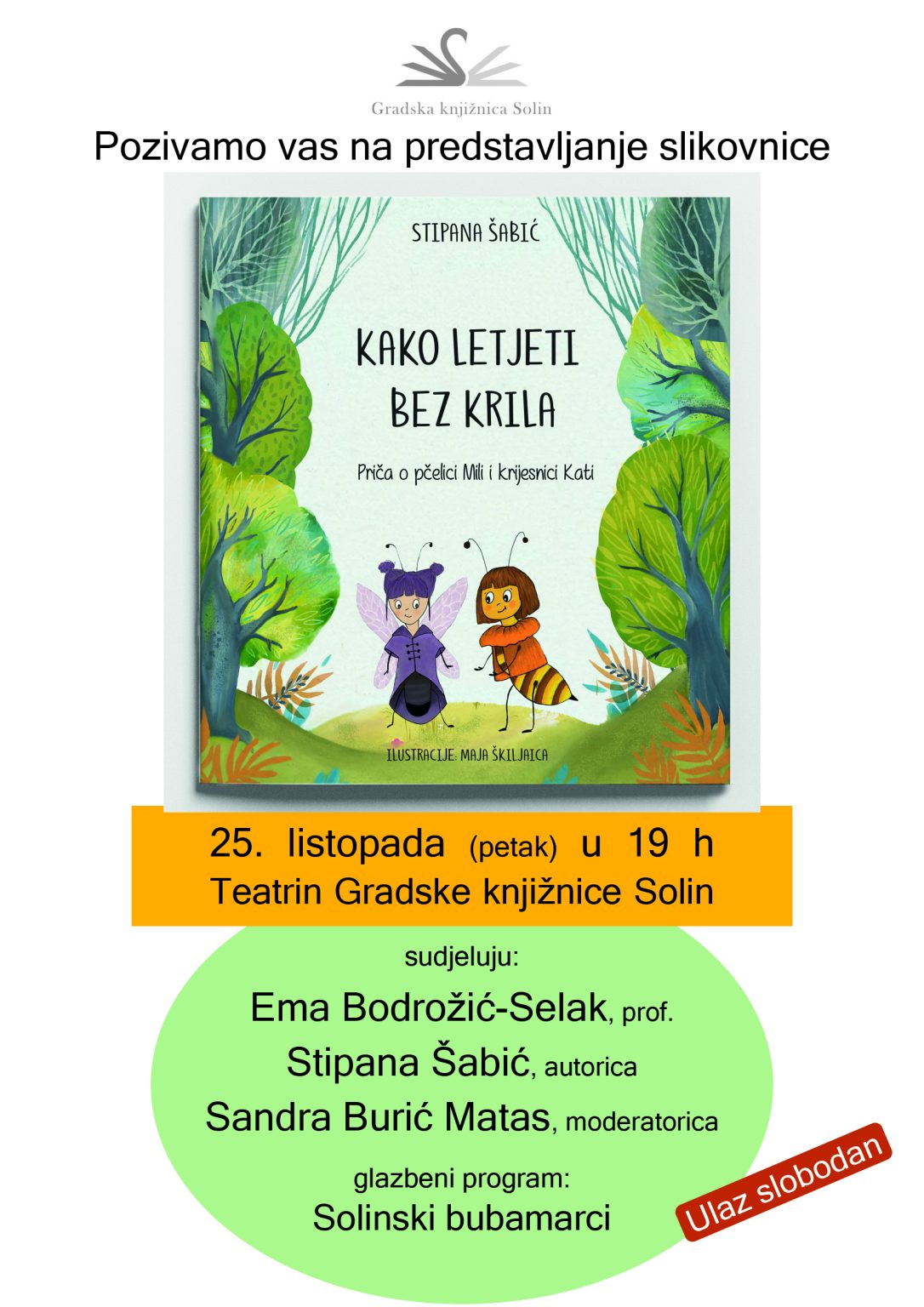 Gradska knjižnica Solin poziva na predstavljanje slikovnice „KAKO LETJETI BEZ KRILA – Priča o pčelici Mili i krijesnici Kati“ autorice Stipane Šabić, a koju je ilustrirala Maja Škiljaica. Predstavljanje će se održati u petak, 25. listopada u Teatrinu GK Solin s početkom u 19:00 sati. Slikovnicu će uz autoricu predstaviti i profesorica Ema Bodrožić-Selak, a večer će moderirati Sandra Burić Matas. U glazbenom programu sudjeluju Solinski bubamarci.