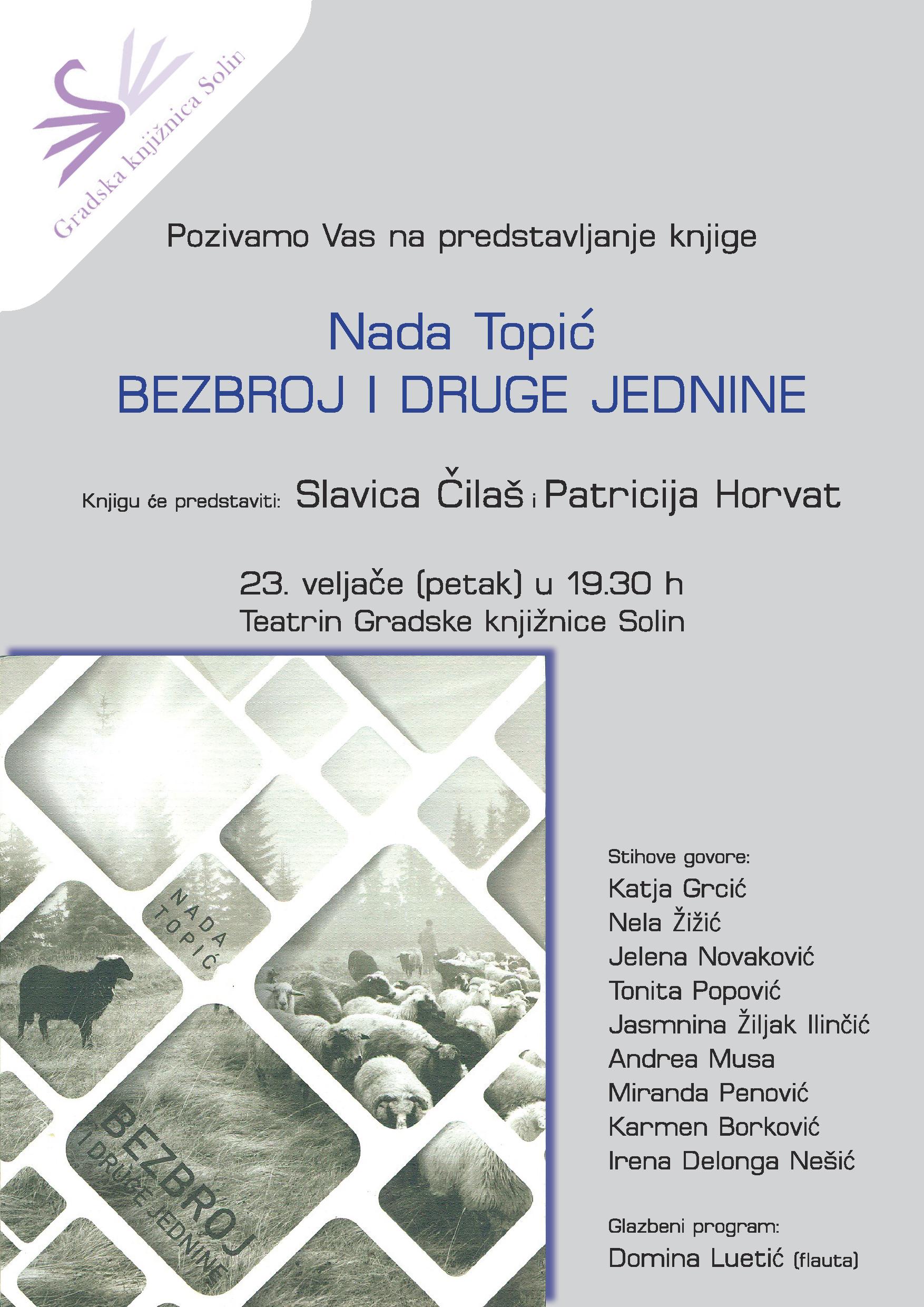 Gradska knjižnica Solin poziva na predstavljanje nove zbirke poezije Nade Topić, BEZBROJ I DRUGE JEDNINE