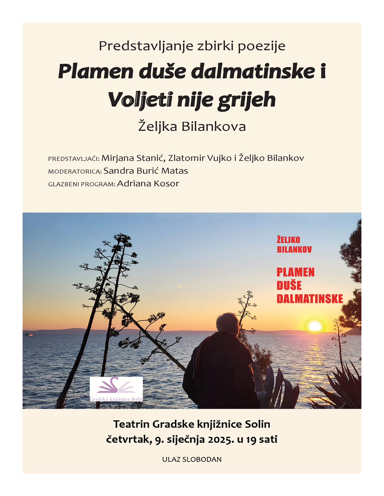Gradska knjižnica Solin poziva na predstavljanje dviju zbirki poezije Željka Bilankova u četvrtak 9. siječnja 2025. u 19 sati.