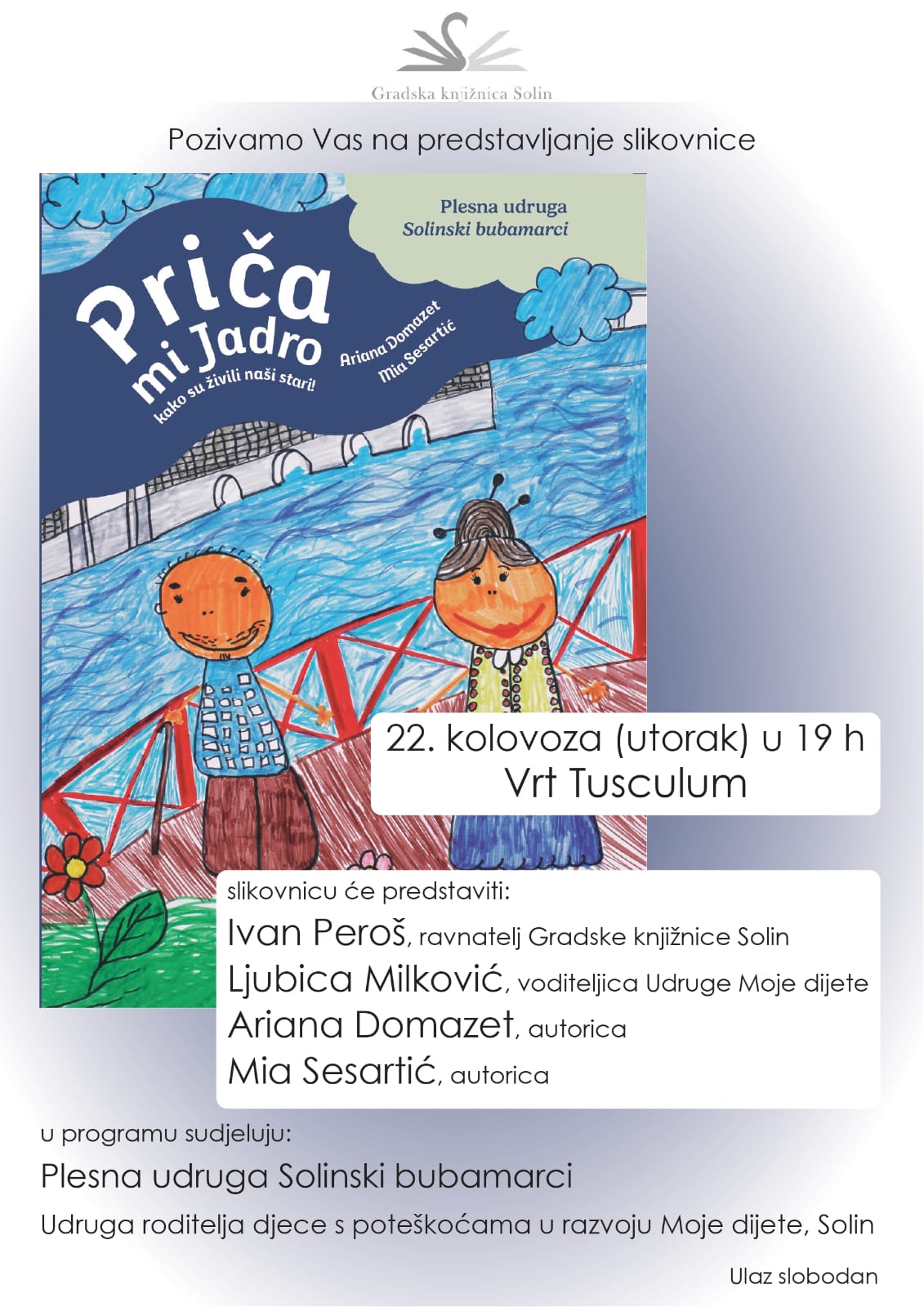 Pozivamo vas na predstavljanje dječje slikovnice „PRIČA MI JADRO” – kako su živili naši stari autorica Ariane Domazet i Mie Sesartić te Plesne udruge „Solinski bubamarci”. Slikovnicu su ilustrirali članovi Udruge roditelja djece s poteškoćama u razvoju „Moje dijete”, Solin. Predstavljanje će se u sklopu Solinskog kulturnog ljeta održati u utorak, 22. kolovoza u Vrtu Tusculum s početkom u 19 sati.