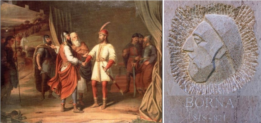 „Ljudevit župan posavskih Hrvatah“ (kolorirana litografija iz druge polovice XIX. st.; F. J. Mücke); suvremeni reljef s likom kneza Borne postavljen u Otočcu (autor M. Čvrljak)