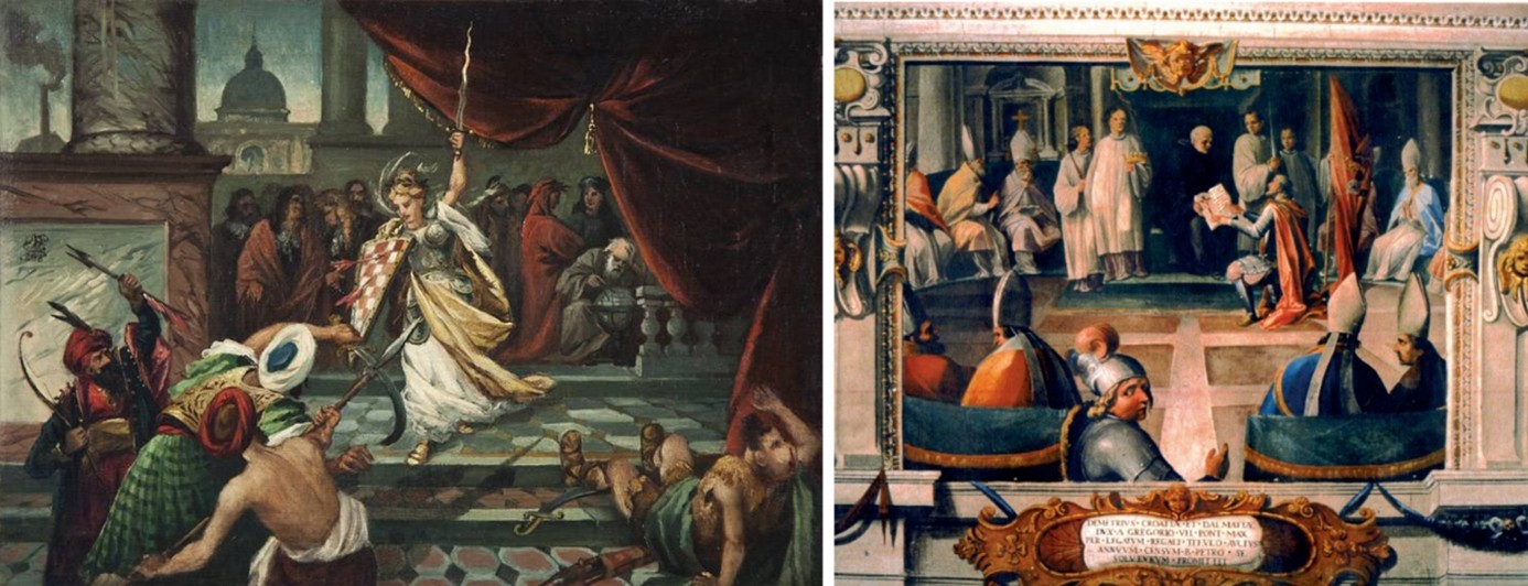 „Antemurale Christianitatis“ („Predziđe kršćanstva“) – još jedno djelo povijesnog slikarstva XIX. stoljeća autora Ferdinanda Quiquereza (nastalo 1893. godine) na kojem personifikacija Hrvatske drži upravo štit sa šahiranim poljima; Zidna slika koju je između listopada 1610. i prosinca 1614. godine izradio Marzio Ganassini (Città del Vaticano, Palazzo Apostolico, Archivio Segreto Vaticano, Piano Nobile, druga soba), a prikazuje krunidbu Dmitra Zvonimira 1075. godine u Solinu