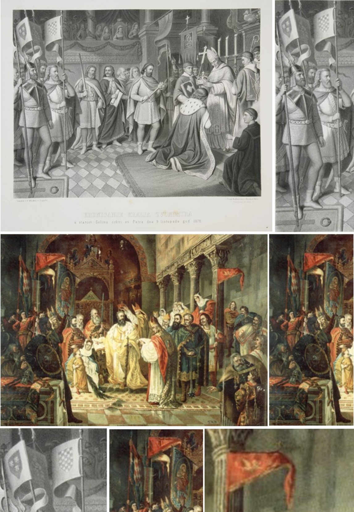 Primjerice, kada je početkom XVII. stoljeća M. Ganassini prikazao krunidbu kralja Zvonimira na fresci koja se i danas nalazi na zidu Vatikanskog tajnog arhiva, u tu je ceremoniju uklopio samo purpurnu zastavu s papinskim znamenjem, dakle bez ikakvih „kockica“ iz grba Hrvatske. No, u vrijeme nacionalnog „buđenja“ tijekom druge polovice XIX. stoljeća, motivi kralja Zvonimira i njegove krunidbe su bili osobito popularni pa je Zvonimirovu krunidbu tada umjetnički prikazao hrvatski slikar Josip Franjo Mücke (1819.-1883.), a 1878. godine i njegov učenik Ferdinand Quiquerez (1845.-1893.). Likovni prikazi obojice slikara, nastali u duhu nacionalnog romantizma, u svoju su likovnu simboliku naravno uključili i zemaljske grbove Hrvatske i Dalmacije na zastavama, kojima nema traga na vatikanskoj fresci s početka XVII. stoljeća!
