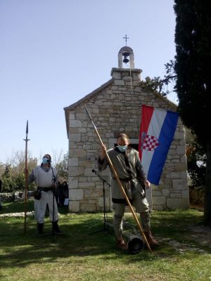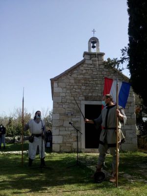 Sudionici projekta „Sačuvajmo Bijaće u 21. stoljeću!“ s povijesnim postrojbama („Domagojevi strijelci“ – Vid, „Tomislavova straža“ – Split i „Vitezovi kralja Zvonimira“ – Knin) u Bijaćima, 3. ožujka 2015.
