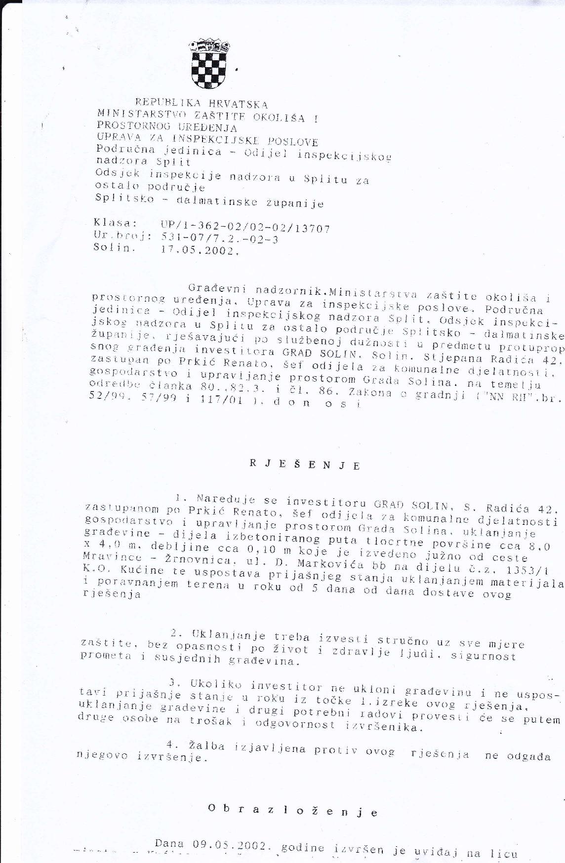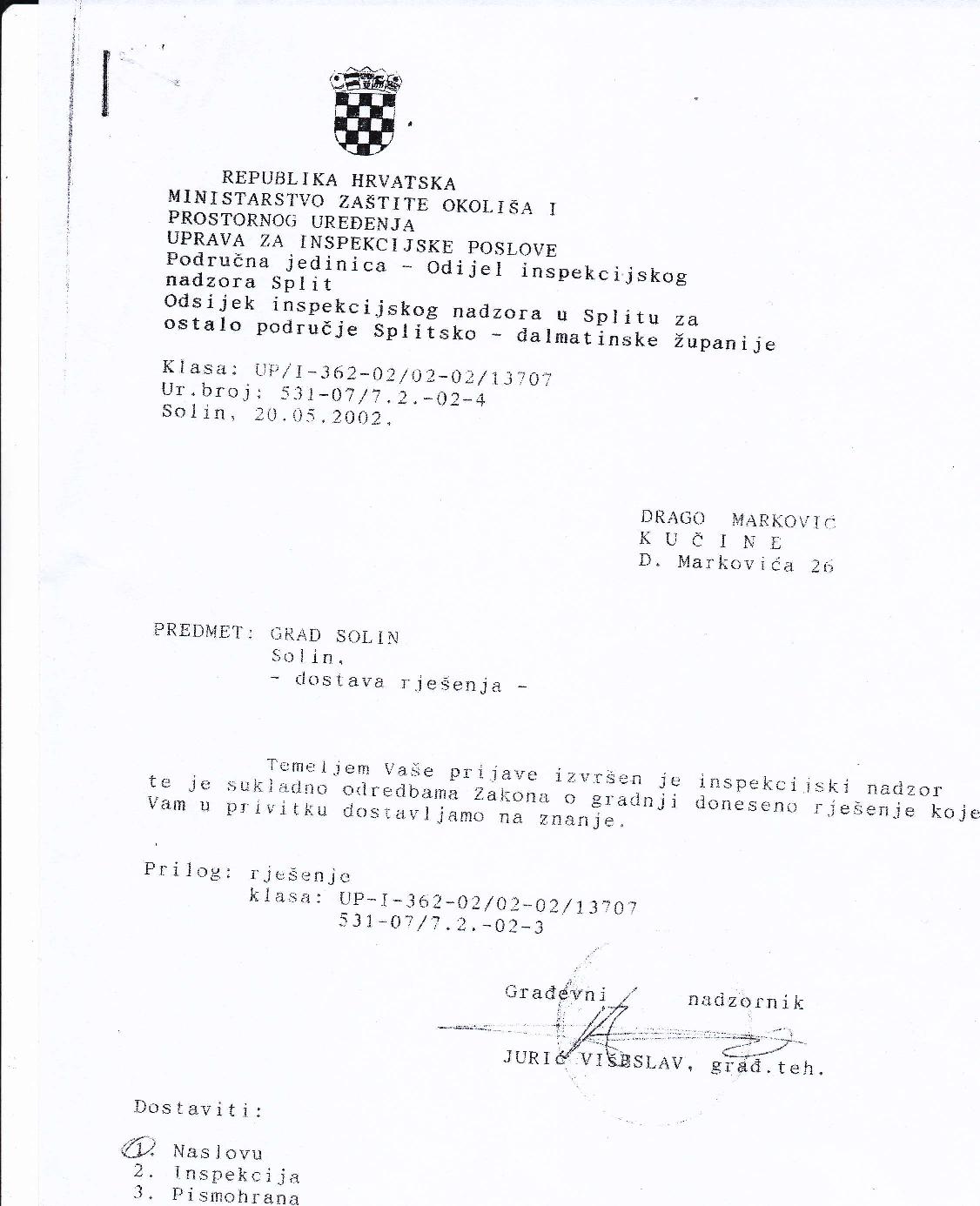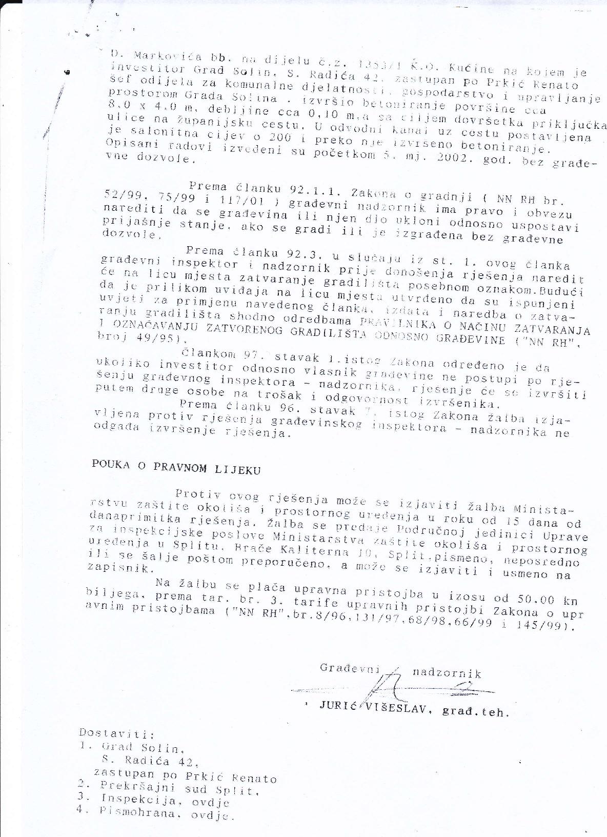 U prilogu su i dokazi da je gospodin Renato Prkić kao šef odjela za komunalne djelatnosti gospodarstvo i upravljanje prostorom Grada Solina, dobio nalog da isto mora ukloniti, šta do dana današnjeg nije učinjeno.