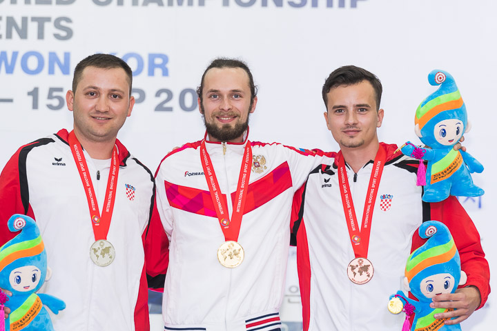 CHANGWON – SEPTEMBER 3: (L-R) Silver medalist Petar GORSA of Croatia, Gold medalist Sergey KAMENSKIY of the Russian Federation and Bronze medalist Miran MARICIC of Croatia pose with their medals after the 10m Air Rifle Men Final at the Changwon International Shooting Range during Day 2 of the 52nd ISSF World Championship All Events on September 3, 2018 in Changwon, Republic of Korea. (Photo by ISSF Photographers)