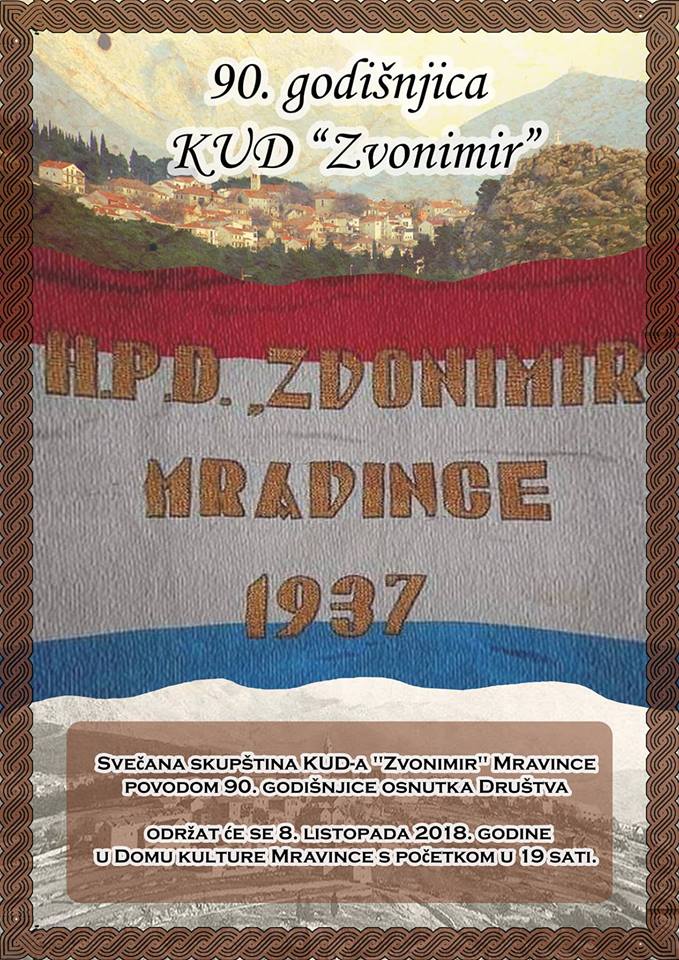 KUD “Zvonimir” Mravince povodom nastanka akta – statuta o osnivanju iz 1928.g. u ponedjeljak dana 08.10.2018.g. u Domu kulture u Mravincima sa početkom u 19:00 sati organizira svečanu Skupštinu KUD-a “Zvonimir” u znak obljetnice 90. godišnjice neprekinutog djelovanja.