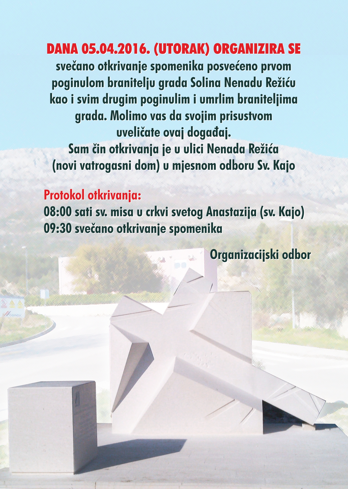 Vijesti ZP Izdvojeno SVEČANO OTKRIVANJE SPOMENIKA PRVOM POGINULOM BRANITELJU GRADA SOLINA – NENADU REŽIĆU Solin Live | tra. 4, 2016