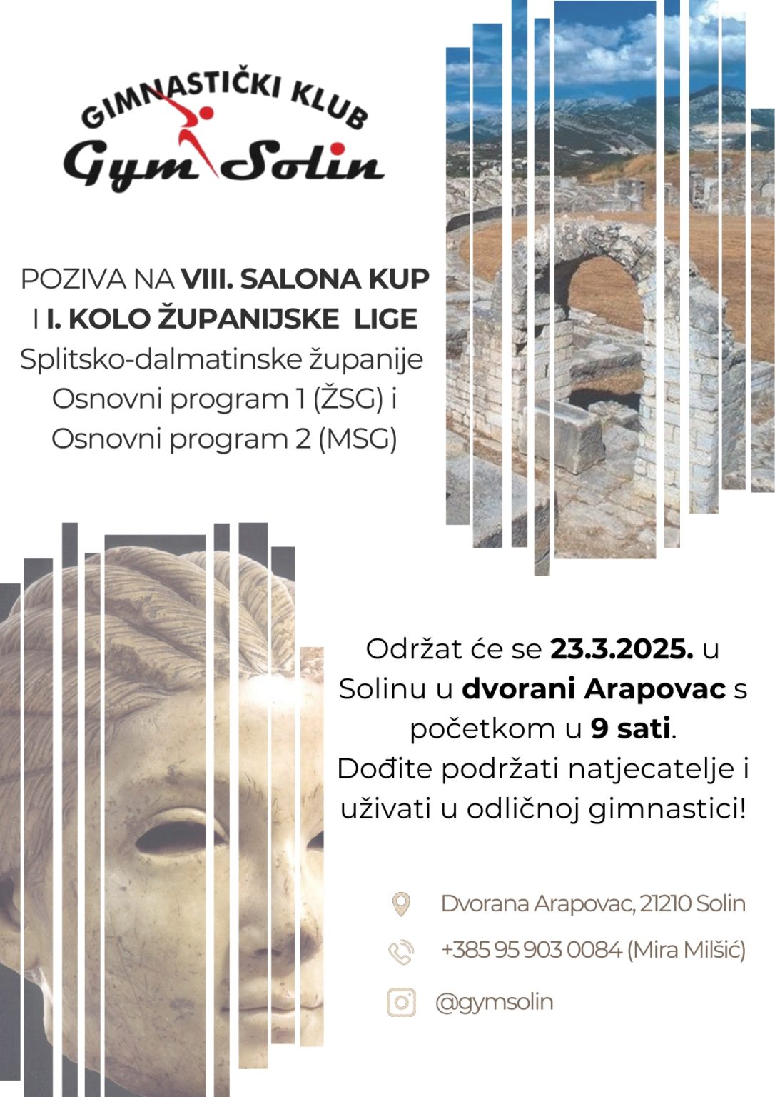 U nedjelju, 23. ožujka 2025. godine s početkom u 9:00 sati, održat će se u dvorani na Arapovcu VIII. SALONA KUP koji je ujedno i I. KOLO ŽUPANIJSKE LIGE Splitsko – dalmatinske županije u organizaciji Gimnastičkog kluba Gym Solin.