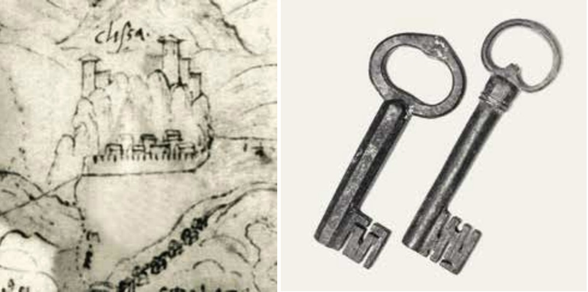 Jedan od prvih prikaza Klisa s početka XVI. stoljeća (grafika nepoznatog autora); Čuveni ključevi kliške tvrđave za koju su se kroz povijest vodile brojne bitke, pa tako i „Uskočki boj za Klis“ (Valter Firić, „Klis: kulturno povijesna baština“, 2018.)
