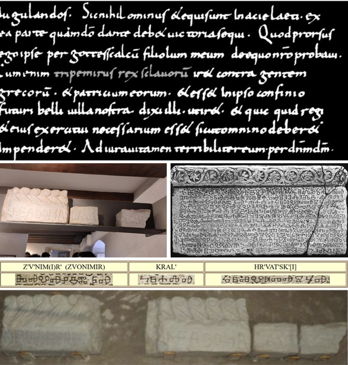 Tri oblika titule kralj („rex“) u povijesnim izvorima starohrvatskog doba: prvi pisani spomen na latinskom – Gottschalkov tekst iz kodeksa „De Trina deitate“ (Bernska knjižnica) s istaknutim spomenom hrvatskog vladara Trpimira – „Tripemirus rex Sclavorum“ (IX.st.); prvi klesani natpis na latinskom – kraljice Domaslave (X. st.), pronađen na kliškoj tvrđavi („Domaslava regina“; prvi klesani natpis na hrvatskom – kralja Zvonimira (“kral hrvatski”) na Baščanskoj ploči (XI./XII. st.)