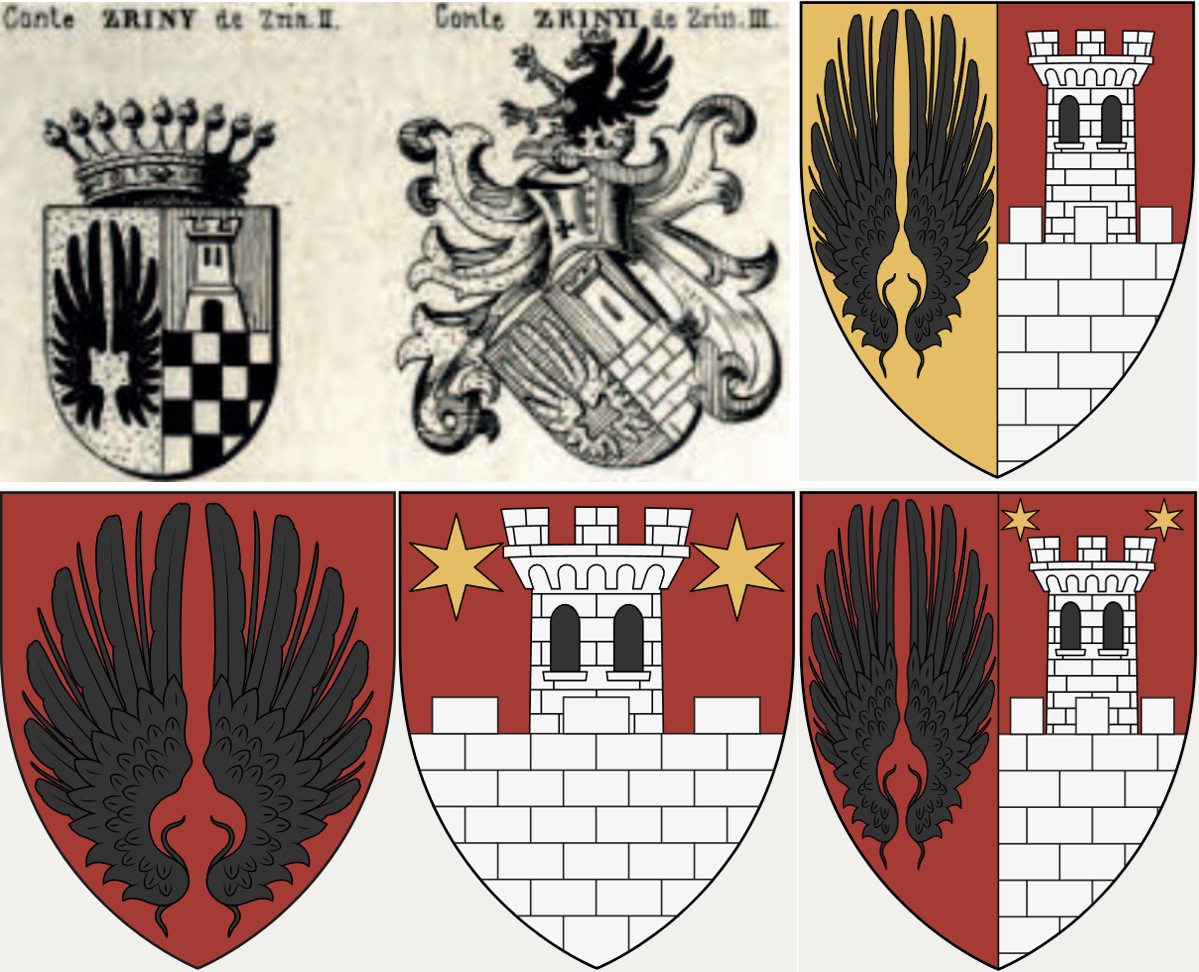 Dvije varijante grba Šubića Zrinskih, kako ih donosi Heyer von Rosenfeld u svojem djelu „Plemstvo Kraljevine Dalmacije“ (1873.) i suvremena rekonstrukcija grbovnog štita hrvatskog bana Jurja V. Zrinskog (1622.-1626.) – grb Šubića Zrinskih nastao je nakon 1546. spajanjem jedne varijante izvornog grba Šubića s grbom izumrle obitelji Ernuszta Čakovečkih (suvremene rekonstrukcije grbovnih štitova Pavla II. Šubića Bribirskog, roda Ernuszta Čakovečkih i Šubića Zrinskih, gospodara Čakovca, Kostajnice, Ozlja…)
