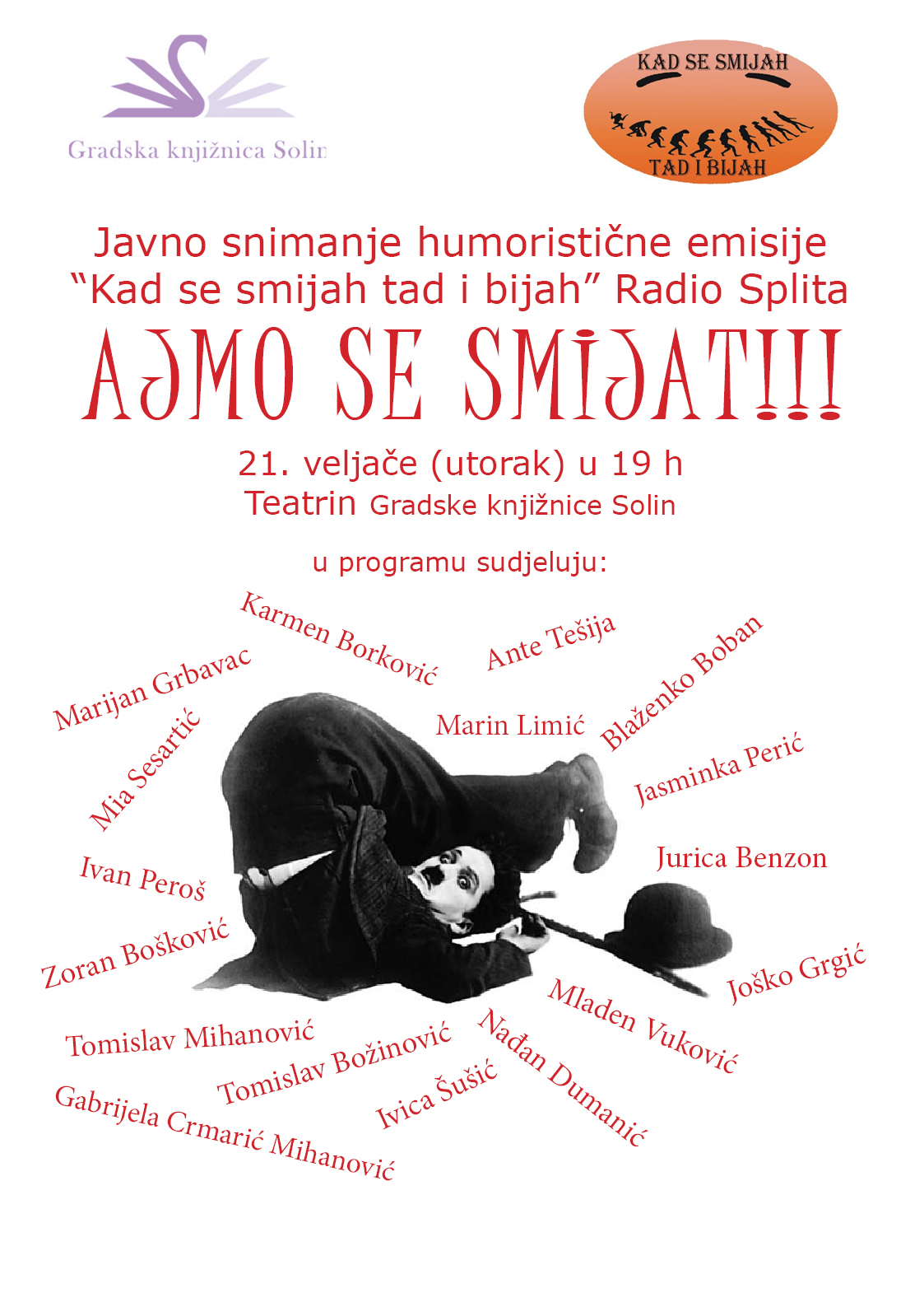 Gradska knjižnica Solin poziva na večer humora AJMO SE SMIJAT i javno snimanje humoristične emisije radio Splita „Kad se smijah tad i bijah“ urednika Mladena Vukovića. Snimanje će se upriličiti u utorak 21. veljače 2017.g. u 19.00h u Teatrinu GKS.
