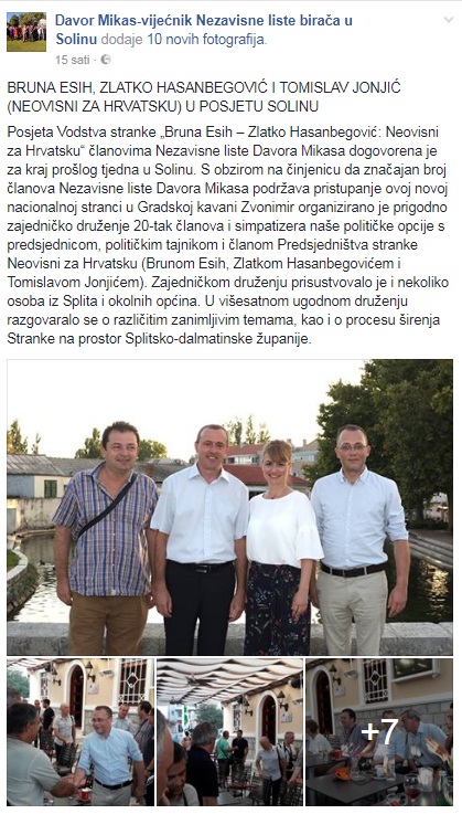 Posjeta Vodstva stranke „Bruna Esih – Zlatko Hasanbegović: Neovisni za Hrvatsku“ članovima Nezavisne liste Davora Mikasa dogovorena je za kraj prošlog tjedna u Solinu. S obzirom na činjenicu da značajan broj članova Nezavisne liste Davora Mikasa podržava pristupanje ovoj novoj nacionalnoj stranci u Gradskoj kavani Zvonimir organizirano je prigodno zajedničko druženje 20-tak članova i simpatizera naše političke opcije s predsjednicom, političkim tajnikom i članom Predsjedništva stranke Neovisni za Hrvatsku (Brunom Esih, Zlatkom Hasanbegovićem i Tomislavom Jonjićem). Zajedničkom druženju prisustvovalo je i nekoliko osoba iz Splita i okolnih općina. U višesatnom ugodnom druženju razgovaralo se o različitim zanimljivim temama, kao i o procesu širenja Stranke na prostor Splitsko-dalmatinske županije.