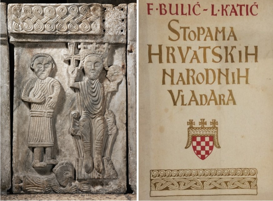Okrunjeni vladar sa starohrvatskom krunom na reljefu u krstionici Sv. Ivana; istovjetna kruna iznad hrvatskog nacionalnog grba na naslovnici djela „Stopama hrvatskih narodnih vladara“ F. Bulića i L. Katića iz 1932. godine