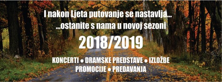 I nakon Ljeta putovanje se nastavlja, ostanite s nama i u sezoni 2018/19, očekuju Vas u našoj zgradi koncerti, dramske predstave, izložbe, predstavljanja knjiga, predavanja, sve u svemu živa jesen, zima i proljeće… a u novom Ljetu i puno novina…